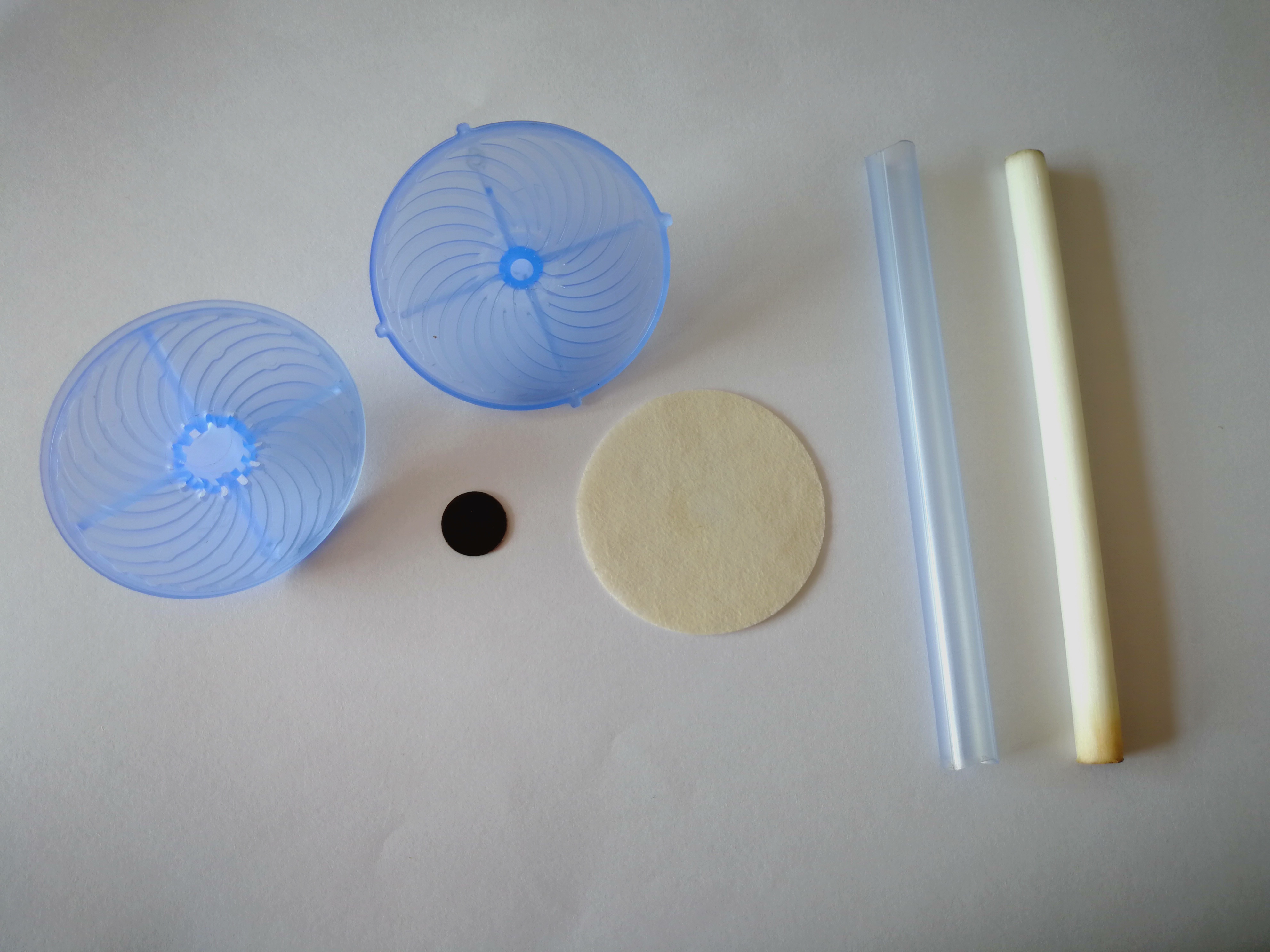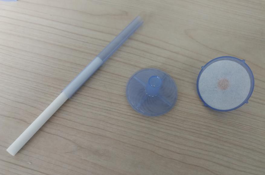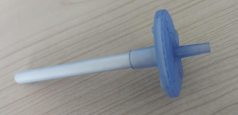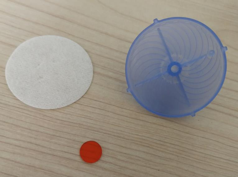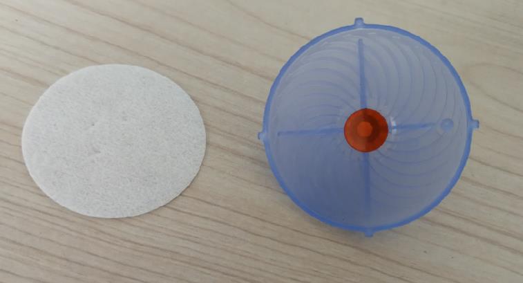 本项目共完成6个零件的自动装配,其中有2个注塑件上伞盖下伞盖,一PVC片直径11.5mm厚0.9mm名称分流片,一直径40mm无纺布片名称湿化体,一段导水壳一段导水芯。自动装配过程:转盘式多工位方式,涉及到两个塑料料扣合,导水芯导水壳插装,湿化体模切后自动就位。